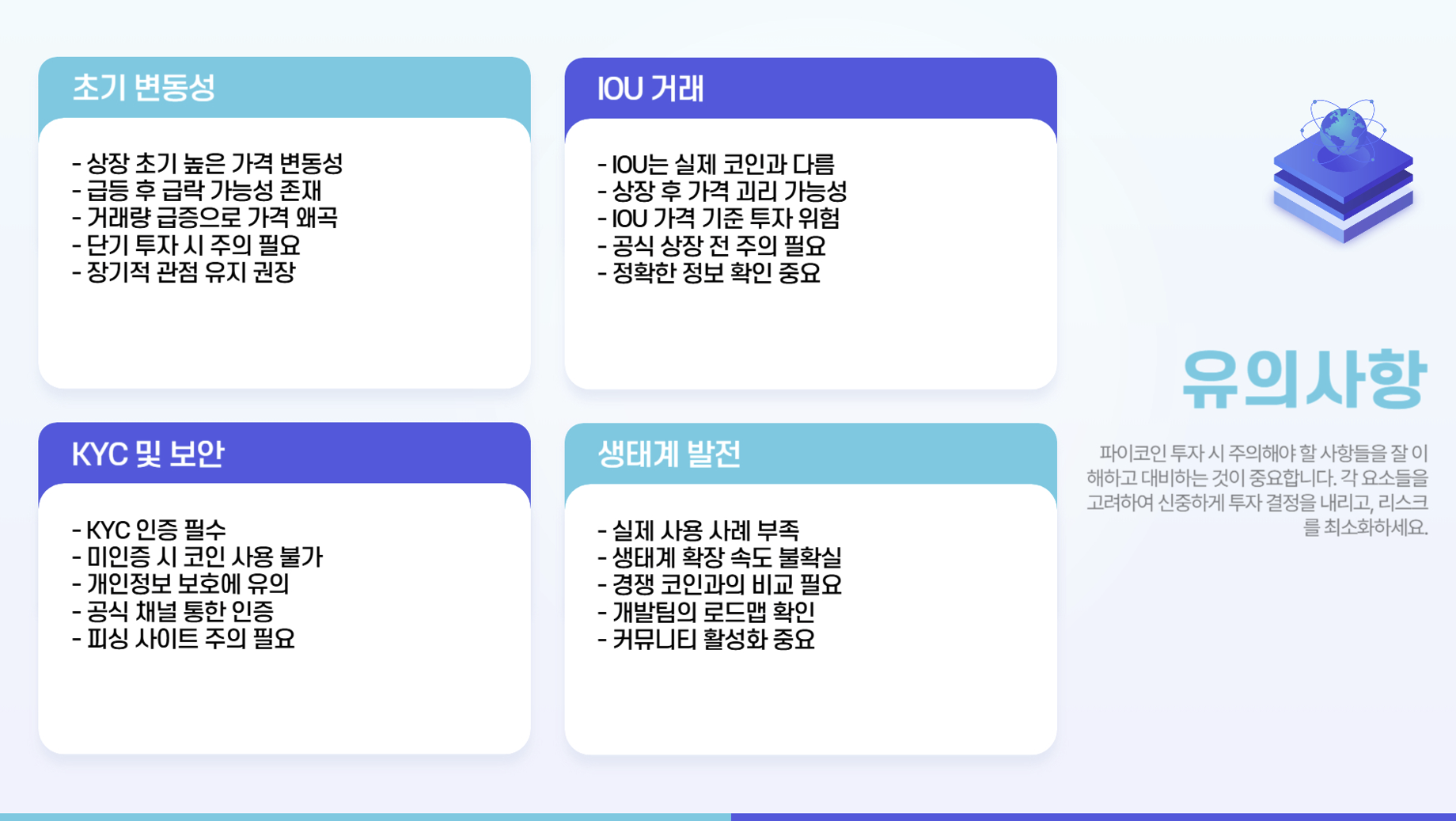 현재 IOU 형태로 거래되는 파이코인은 실제 메인넷 코인이 아니기 때문에 상장 이후 실제 가격과의 괴리가 발생할 수 있습니다. 따라서 IOU 가격을 기준으로 한 투자 결정은 신중해야 합니다.