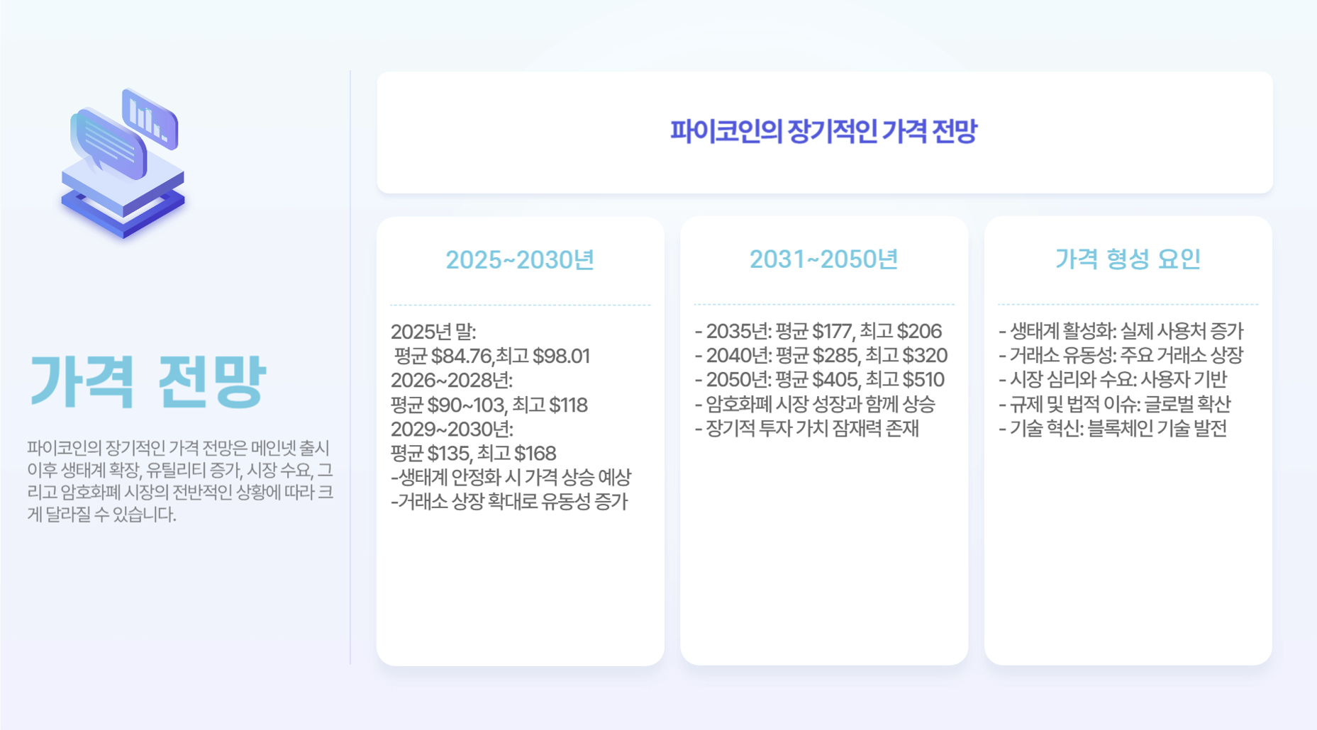 파이코인의 장기적인 가격 전망은 메인넷 출시 이후 생태계 확장, 유틸리티 증가, 시장 수요, 그리고 암호화폐 시장의 전반적인 상황에 따라 크게 달라질 수 있습니다. 아래는 2025년부터 2050년까지의 주요 전망입니다.