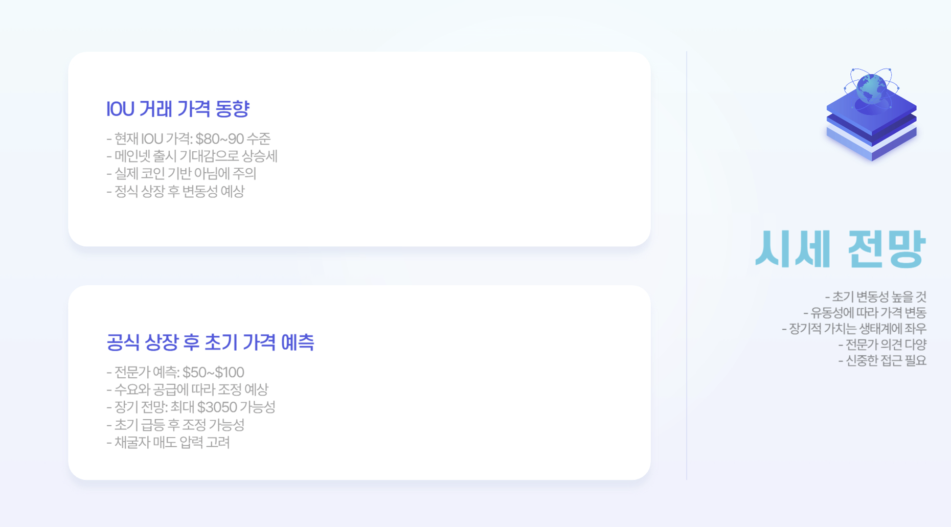 메인넷 출시 후 초반에는 높은 변동성이 예상됩니다. 초기 가격이 급등할 경우 단기 차익 실현을 노린 투자자들이 대량 매도에 나설 가능성이 있어 가격이 급락할 수 있습니다.