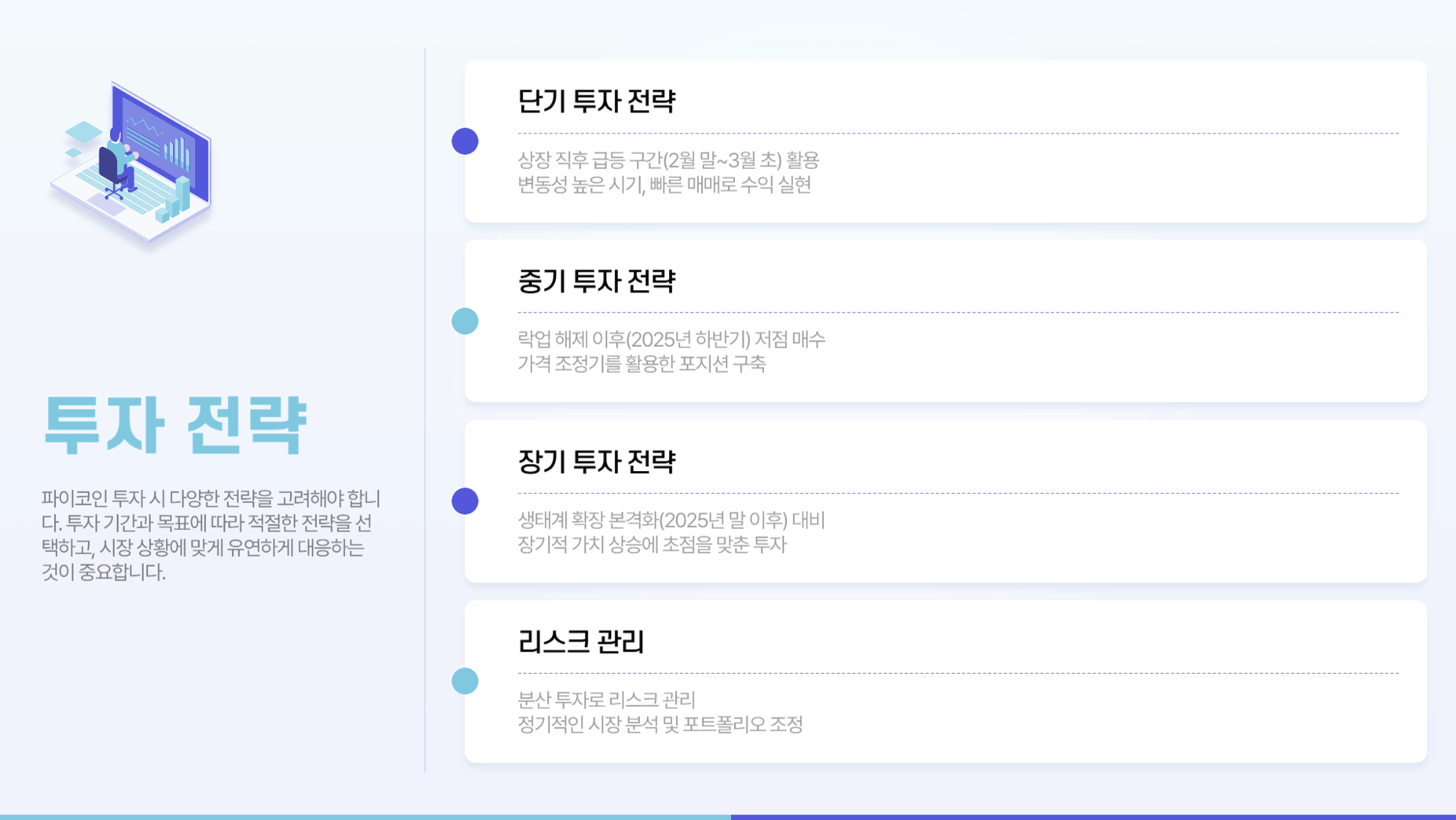 - 장기 투자: 생태계 확장이 본격화되는 시점(2025년 말 이후)에 안정적인 성장 가능성을 고려.
