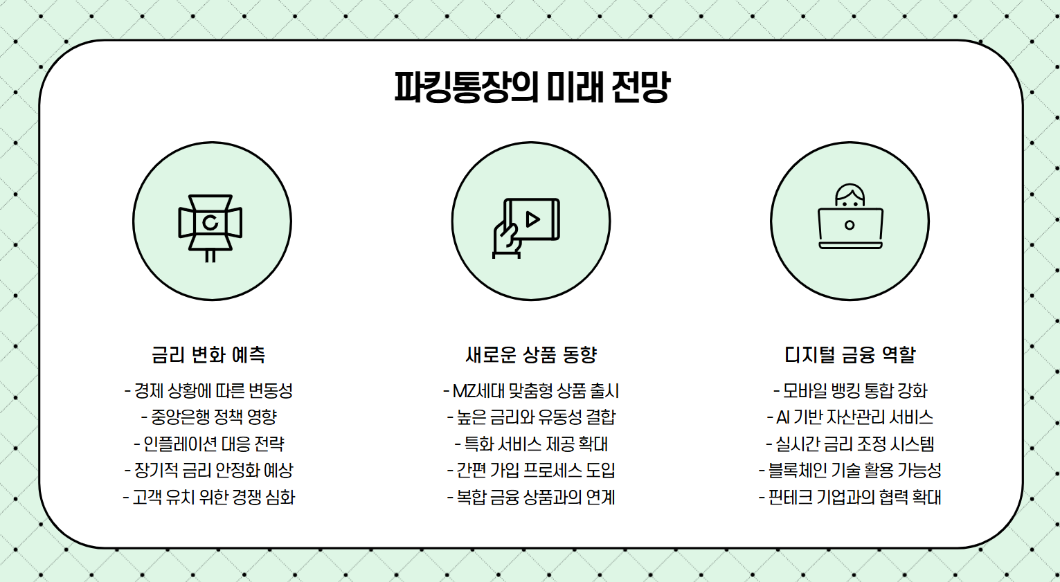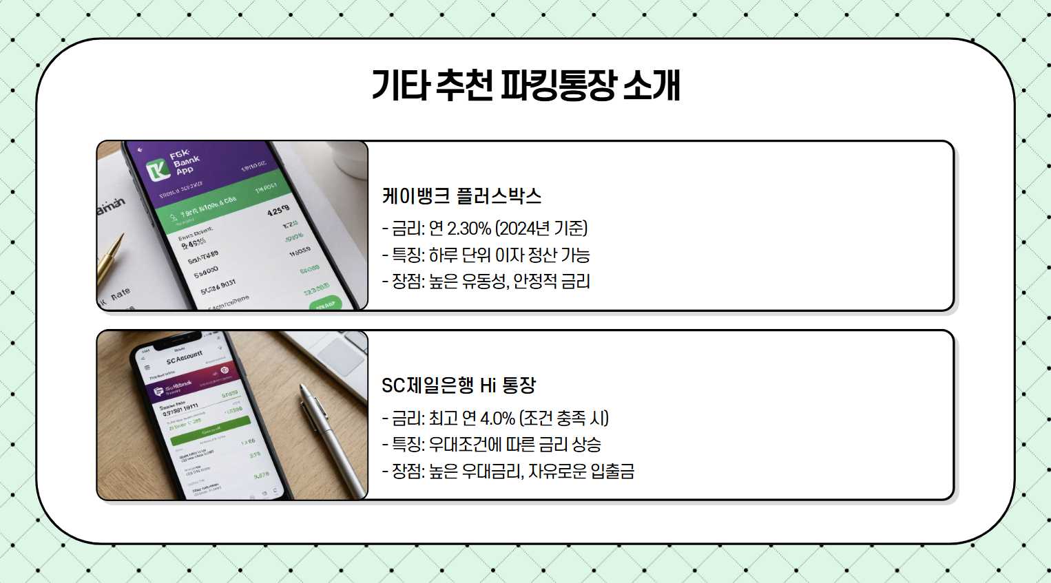 즉, 파킹통장은 높은 유동성을 유지하면서도 이자를 받을 수 있는 상품으로, 비상금이나 단기 여유 자금 관리에 매우 유용합니다.