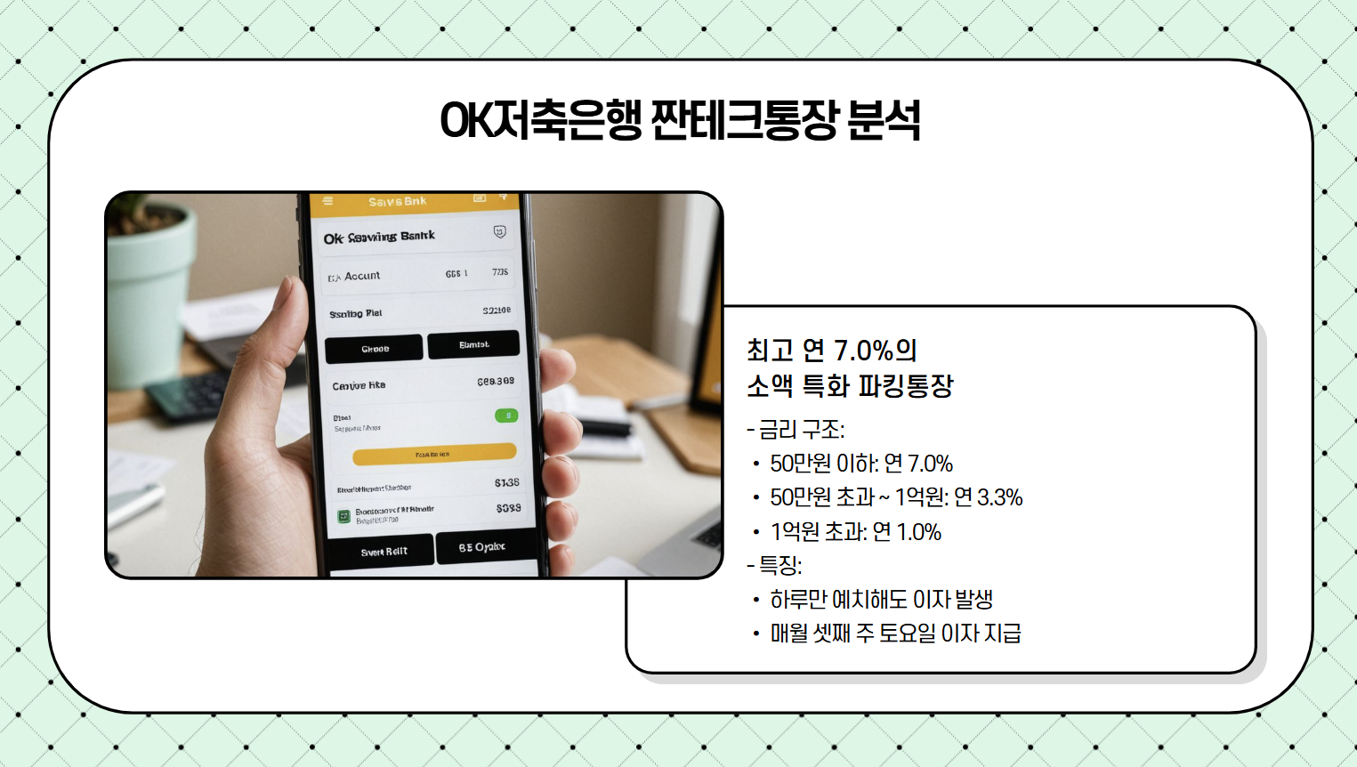| 1위 | OK저축은행 짠테크통장 | 7.0% | 50만 원 이하 예치 시 최고 금리, 초과 시 3.3% 적용 |