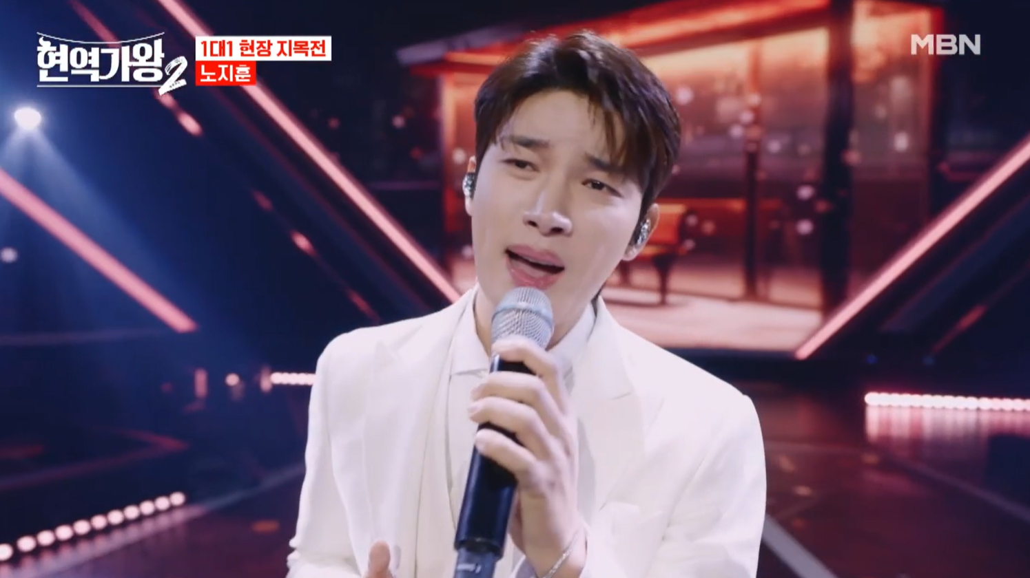노지훈: 흰색 롱코트를 입고 ‘미운 사랑’을 감성적으로 소화하며 "기복 없는 보컬"이라는 호평