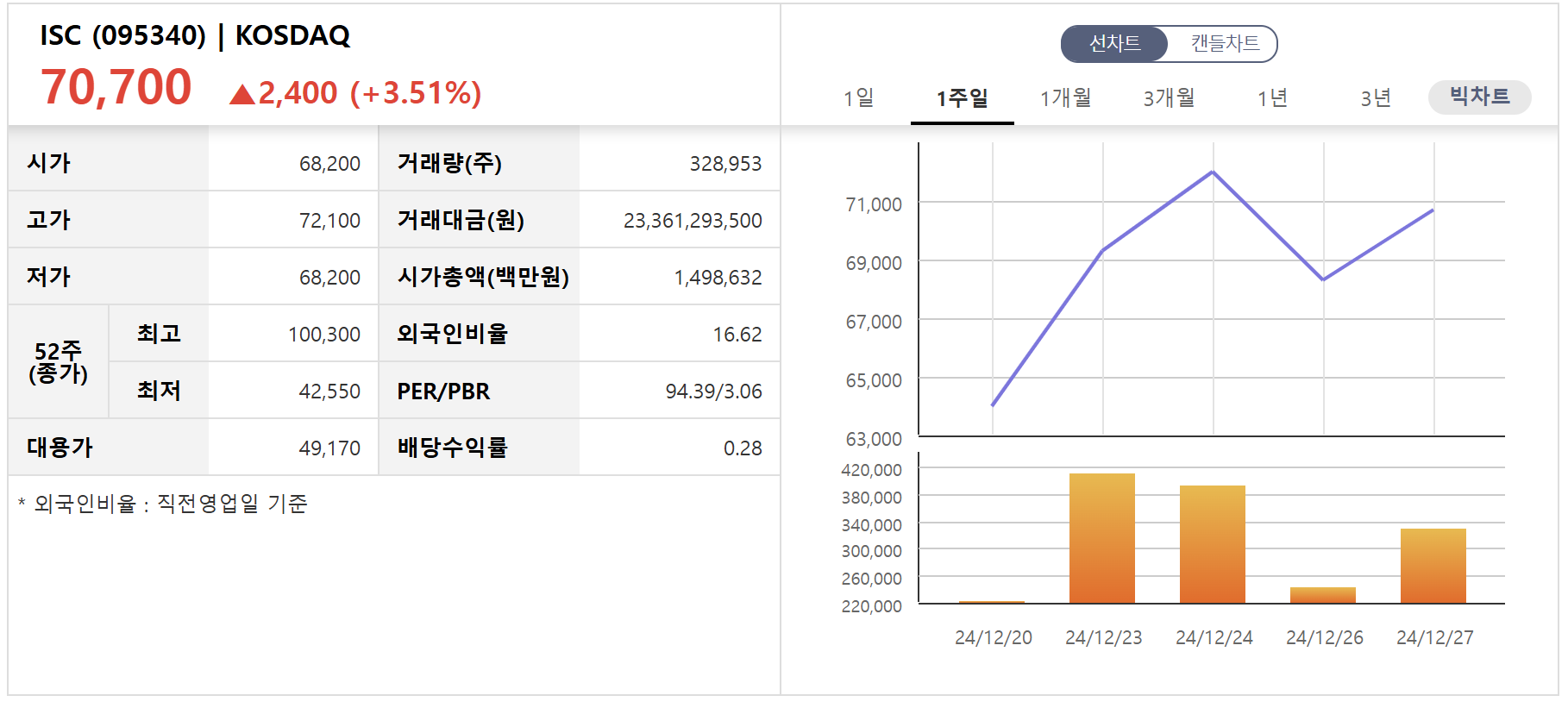 ISC의 주가는 2024년 12월 기준 약 12만 원으로, 환율 상승과 반도체 업황 회복의 영향으로 연초 대비 약 40% 상승했습니다. SKC와의 협력이 장기적 성장 모멘텀을 지원하고 있습니다.