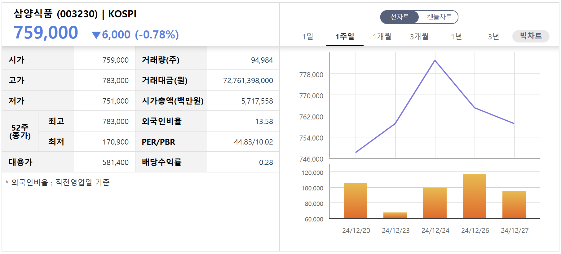 삼양식품의 주가는 2024년 12월 기준 약 74만 원으로, 올해 초 대비 246% 상승하며 사상 최고치를 기록하고 있습니다. 증권사들은 목표 주가를 100만 원으로 상향 조정하며 지속적인 성장 가능성을 높게 평가하고 있습니다.