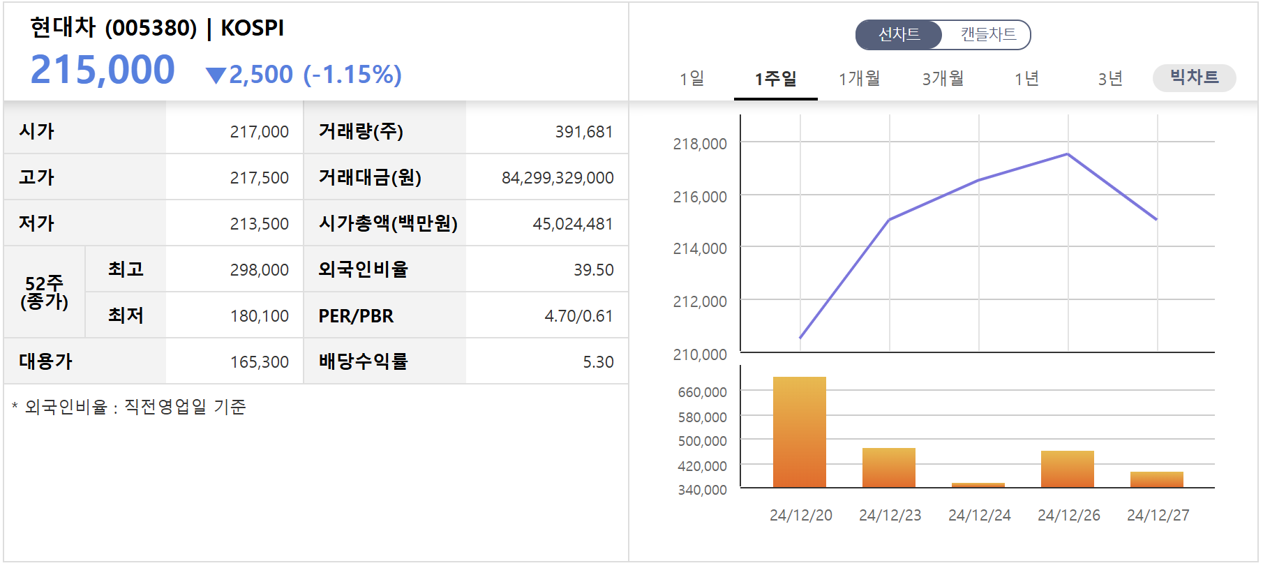 2024년 12월 기준 현대자동차의 주가는 약 32만 원으로, 목표 주가 상단인 34만 원에 근접하고 있습니다. 전기차와 자율주행차 부문에서의 지속적인 성장이 주가 상승의 주요 동력으로 작용하고 있습니다.