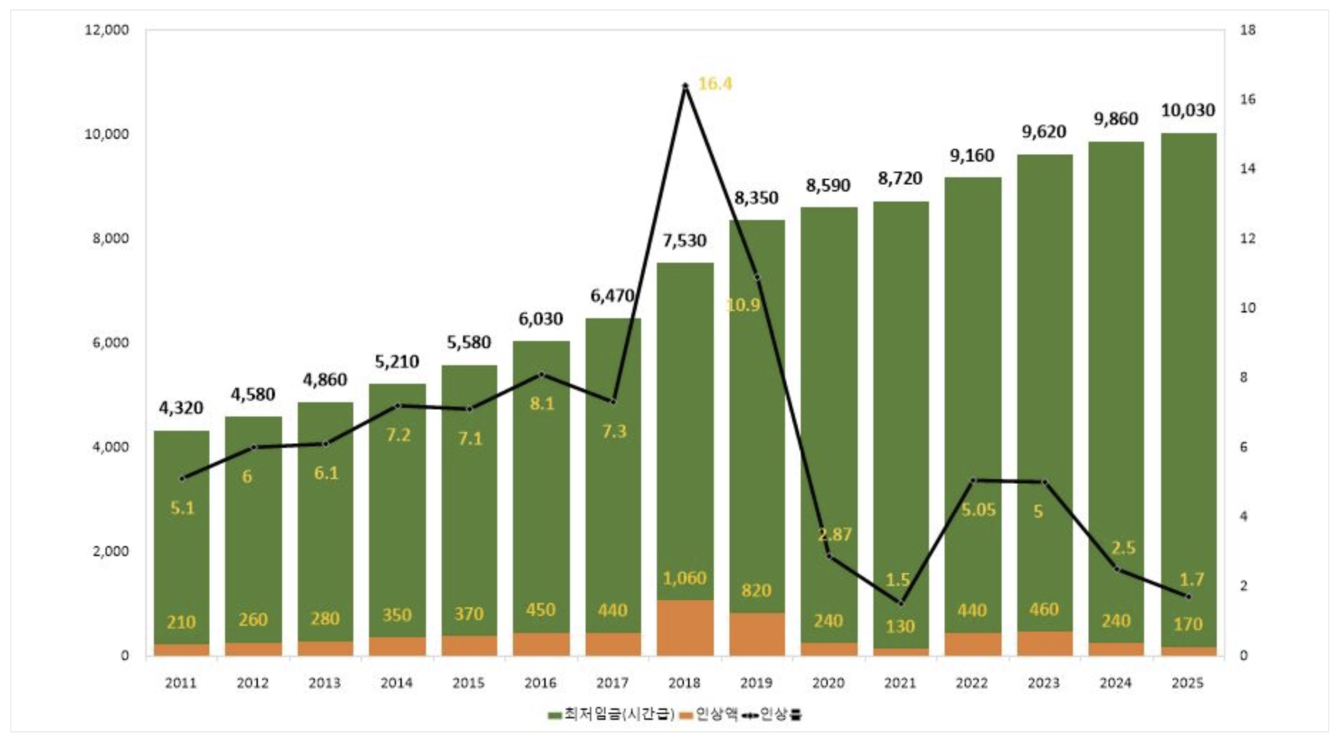2025년 최저시급은 10,030원으로 확정되었습니다. 이는 2024년 대비 1.7% 인상된 금액입니다. 주휴수당은 최저임금을 기준으로 계산되므로, 최저임금이 오르면 주휴수당도 함께 증가합니다.