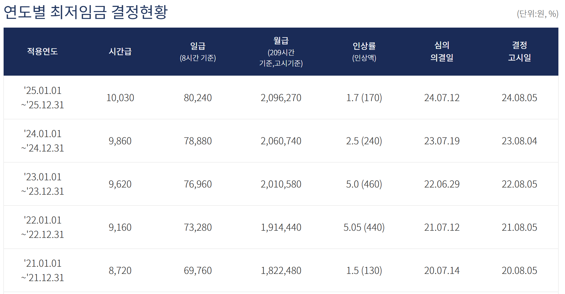 2025년 최저임금은 시간당 10,030원으로 결정되었습니다. 이는 2024년 대비 1.7% 상승한 금액으로, 최초로 만 원을 돌파했습니다. 이를 기준으로 하루 8시간, 주 5일 근무 시 다음과 같이 계산됩니다: