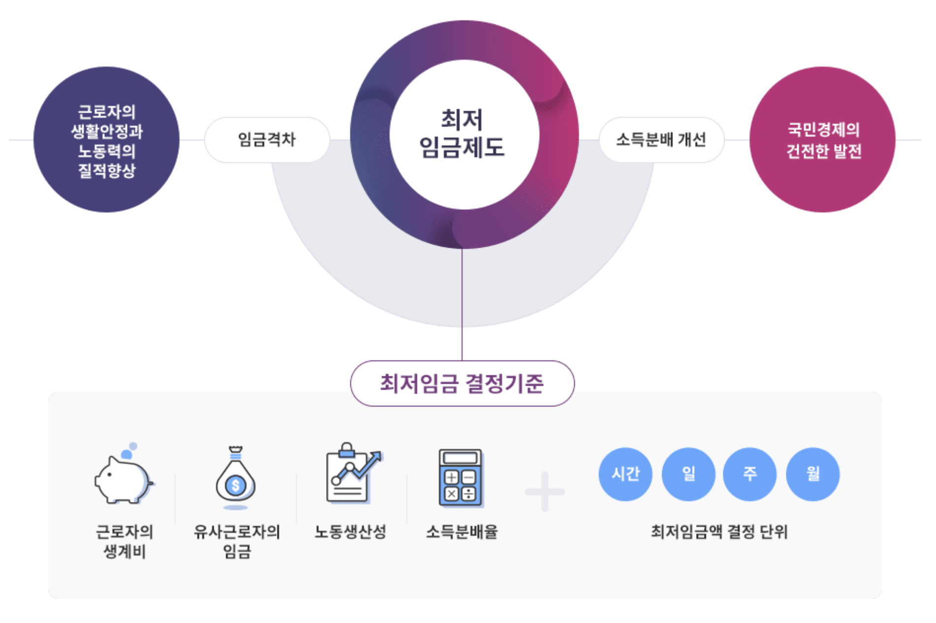 최저임금은 근로자가 노동의 대가로 받을 수 있는 최소한의 금액으로, 정부가 법으로 정합니다. 이를 통해 임금 수준이 낮은 근로자를 보호하는 것이 목적입니다. 대한민국에서는 1988년부터 매년 최저임금을 정하고 있습니다. 시간당 임금 기준으로 이야기할 때는 흔히 최저시급이라고 부르기도 합니다.