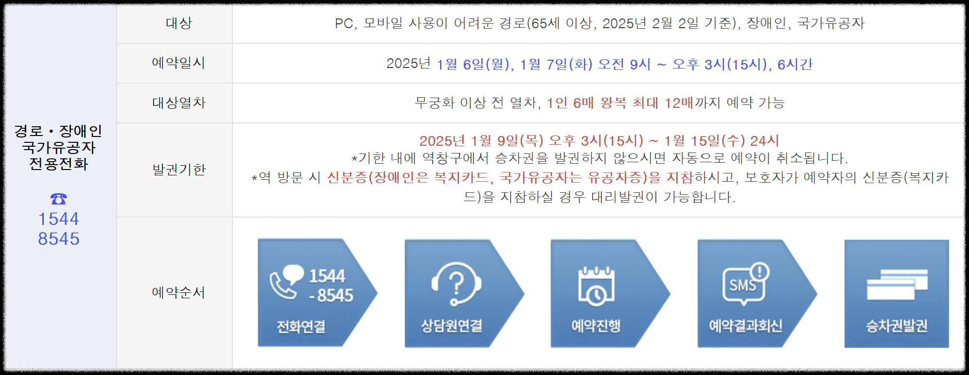 - 예매 대상 기간: 설날 연휴 전후, 2025년 1월 24일(금) ~ 2월 02일(일)까지 운행하는 열차